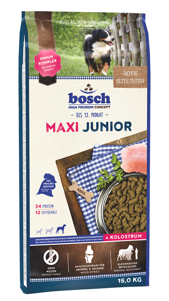 MAXI JUNIOR ist ein eiweißreduziertes, weizenfreies Aufzuchtfutter (24 % Eiweiß) mit moderatem Energiegehalt zur Aufzucht großer Rassen (ab 25 kg Endgewicht), bei denen wegen m&ouml-glicher Knorpel- und Gelenkprobleme eine zu hohe Wachstumsgeschwindigkeit vermieden werden muss.