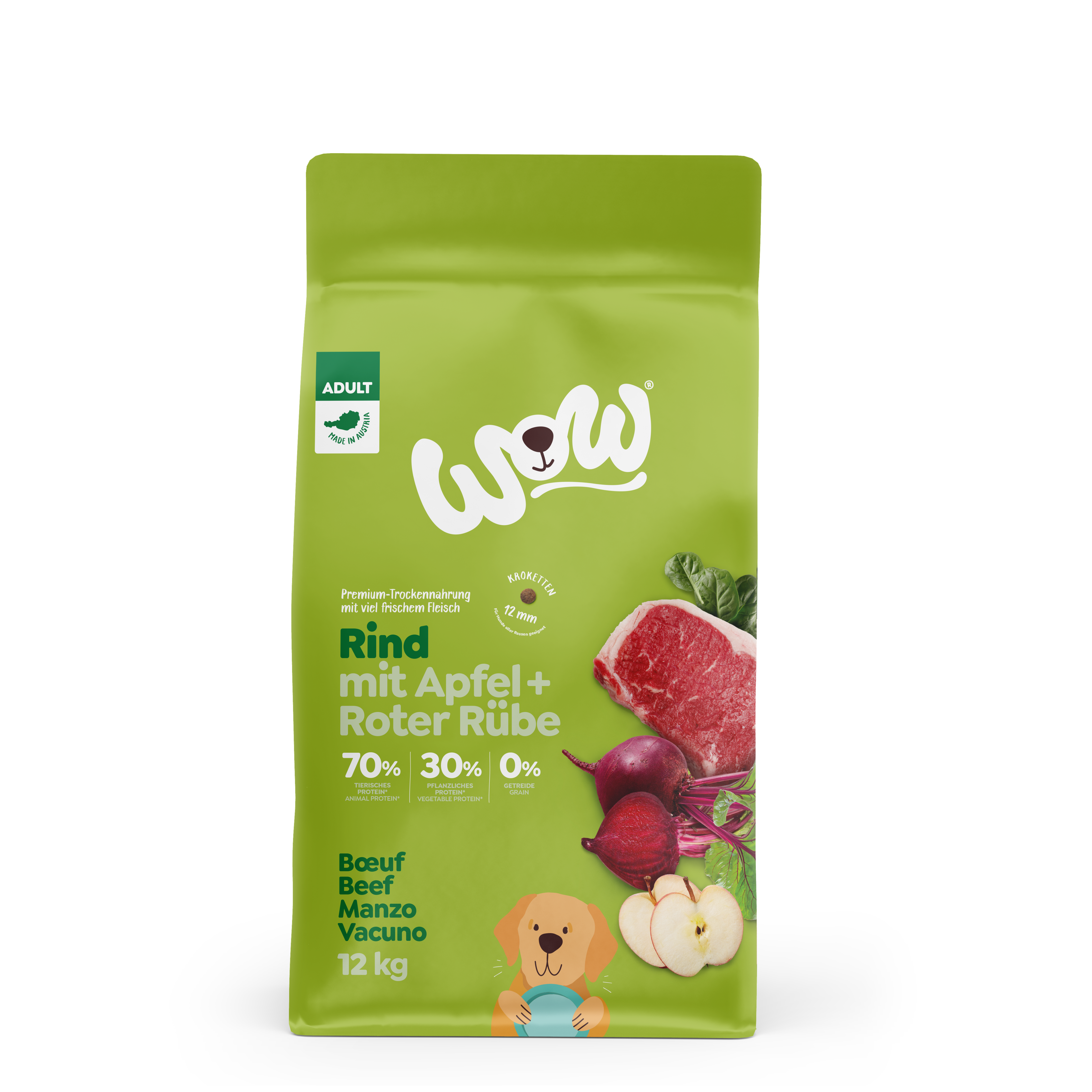Rind 42% (Frisches Rindfleisch 25 %, Rinderprotein getrocknet 17 %), Kartoffeln 20%, Erbsen, Süßkartoffeln 8%, Rinderfett, Rübenschnitzel (entzuckert), Rapsöl, Spinat 1%, Rote Rüben 0,9%, Leinsamen, Karotten, Kräuter, Flohsamen, Äpfel 0,1%, Yucca Schidigera, Mineralstoffe, FOS 0,1%, MOS 0,1%